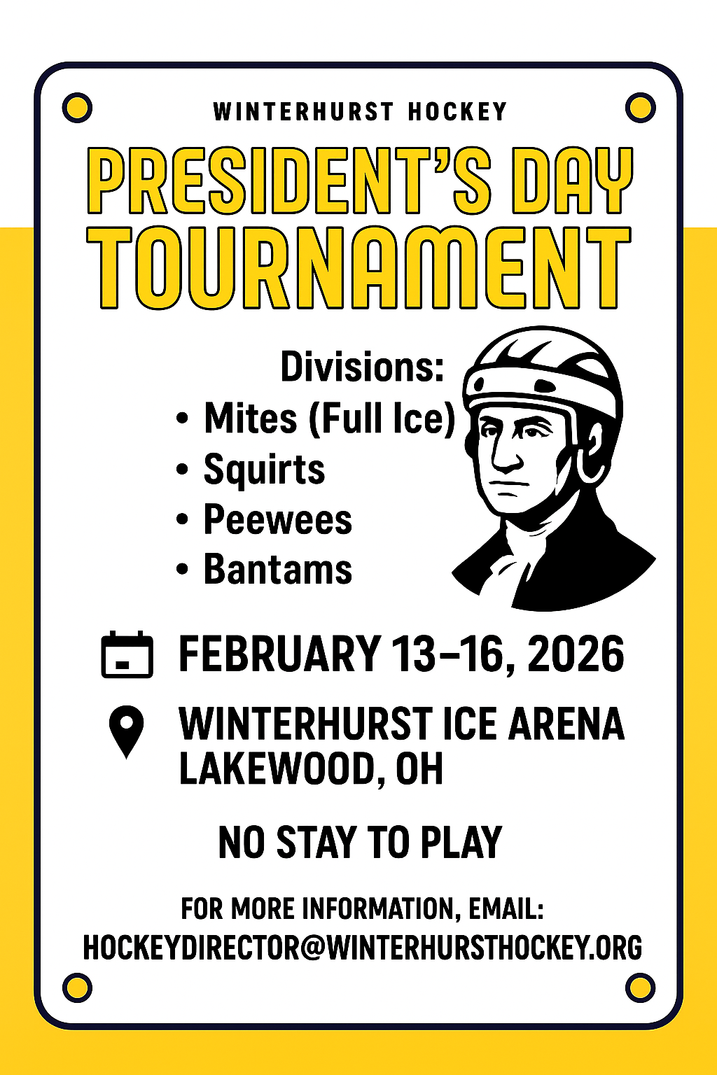 Join Winterhurst Hockey Association for our annual Presidents' Day tournament! Games at our home rink - Winterhurst Ice Arena near Cleveland, Ohio! Competitive divisions and NO stay to play!